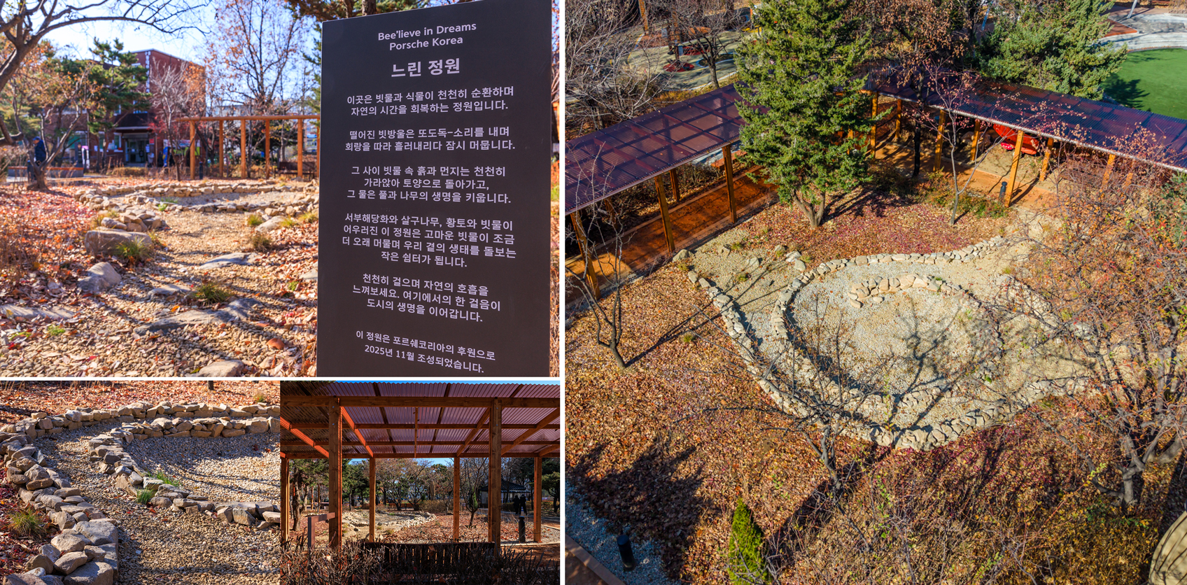 จ์ด์. ๋๋ฆฐ์ ์์ ์ฐ๋ฆฌ ์ฃผ๋ณ์์ ๊ฐ์ฅ ์ฝ๊ฒ ๋ณผ ์ ์์ง๋ง, ๊ทธ๋์ ๋ ์์คํ ์์ฐ ์์์ธ โ๋ฌผโ์ด ํ๋ฅด๋ ๊ณต๊ฐ์ผ๋ก ์ค๊ณ๋์์ต๋๋ค. ์ฝ 400ใก ๊ท๋ชจ์ ์ฐ๋ชป๊ณผ ํฉํ ๊ธธ, ์๊ฐ๊ณผ ๋์ด ์ด์ฐ๋ฌ์ง ๊ณต๊ฐ์์, ์์ฐ์ ์ํ์ ์จ๋ชธ์ผ๋ก ๋๋ ์ ์์ด์. ํนํ ๊ธฐ์กด ๊ณต์์์ ๊ฐ์ฅ ์ฌ๋๋ฐ๋ ํฉํณ๊ธธ์๋ ํ๊ณ ๋ผ๋ฅผ ์ค์นํด ์ด์ฉ ํ๊ฒฝ์ ๊ฐ์ ํ๊ณ , ๋น๋ฌผ์ด ํ๊ณ ๋ผ ์ง๋ถ๊ณผ ์ฐ์ํต์ ๋ฐ๋ผ ์์ฐ์ค๋ฝ๊ฒ ์ฐ๋ชป๊น์ง ํ๋ฅด๋๋ก ๋ฌผ์ํ ์ฒด๊ณ๋ฅผ ๋ง๋ค์์ต๋๋ค. ์์ค๋ฌผ๋ง์ด ์๋๋ผ, ์ํ์ ๊ฐ์น๋ ๋์น์ง ์์์ต๋๋ค.